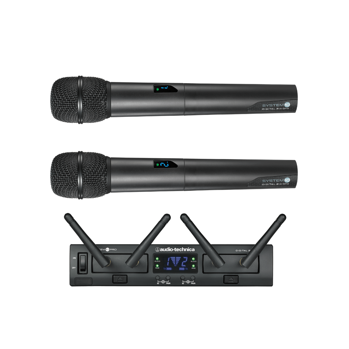 ATW-RC13 랙 마운트 수신기 섀시, ATW-RU13 수신기 유닛 2대, ATW-T1002 핸드헬드 다이내믹 단일지향성 마이크/송신기 2대